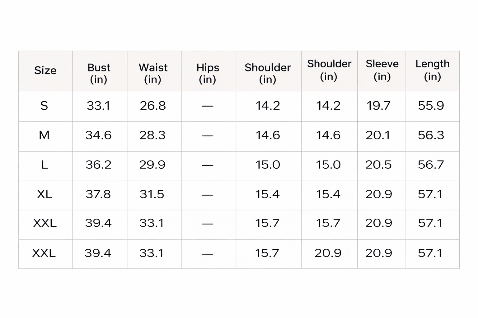 | XS | 6 - 8 | 4 | 34 | 7 |